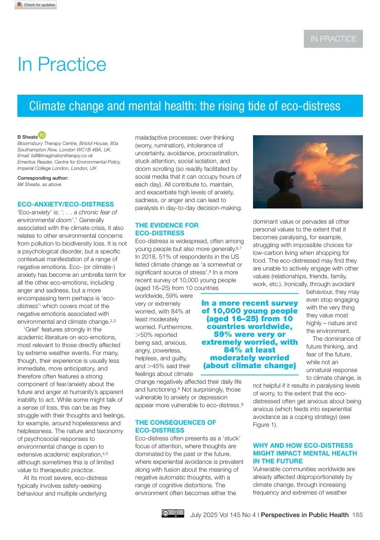 Sheate, Bill. Climate change and mental health: the rising tide of eco-distress. Perspectives in Public Health. 2025;0(0). doi:10.1177/17579139251333289 (Open access). In Practice paper in Special issue on ‘Global Threats to Mental Health’ (July 2025).